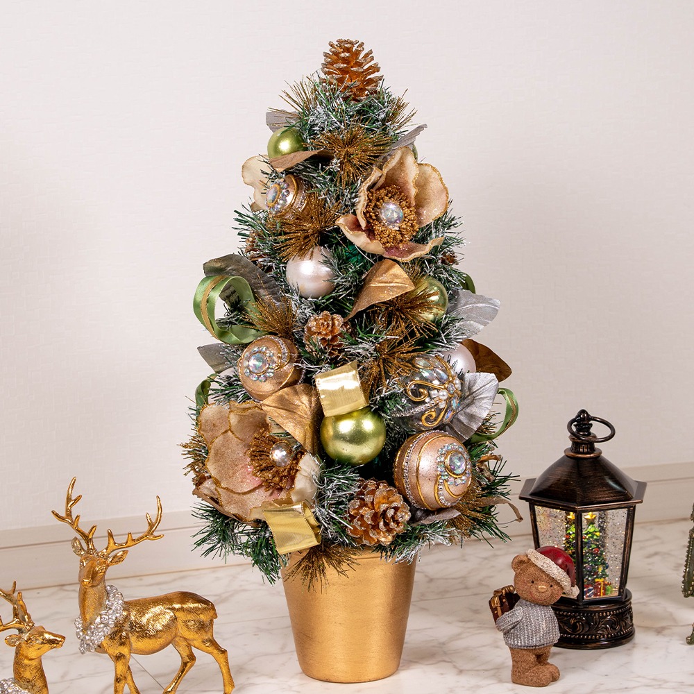 光沢のあるリボンやボールオーナメント、ゴールド・シルバーの葉、松ぼっくり…と、ぎっしり飾りが付いており、ゴールドのポットに入ってとっても豪華です✨