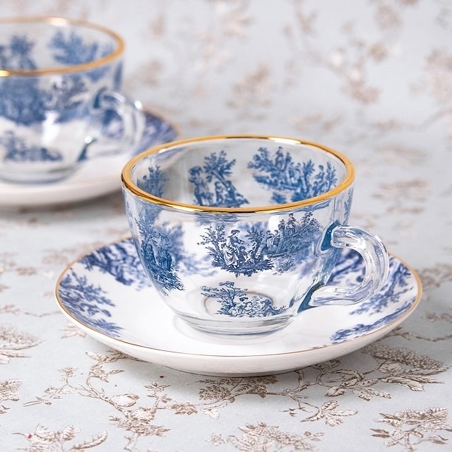 クリアなガラスに、ブルーのトワルドジュイ柄&ゴールドカラーのフチがおしゃれで優雅なリラックスタイムを演出してくれます😌
