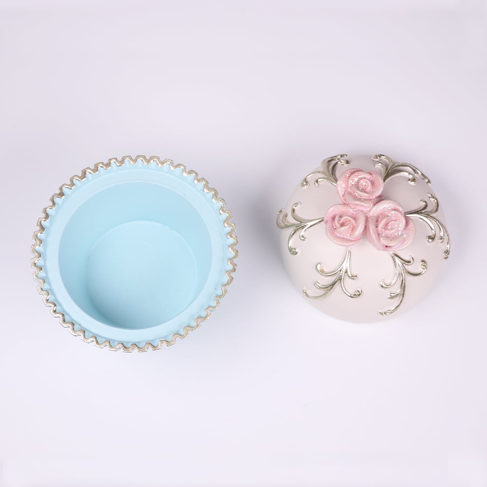 小さなバラの花が3輪デザインされたおしゃれなカップケーキ型の小物入れ。