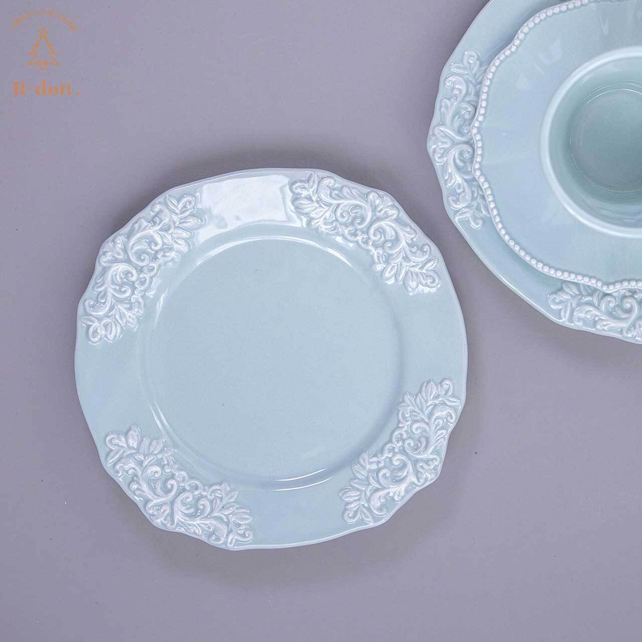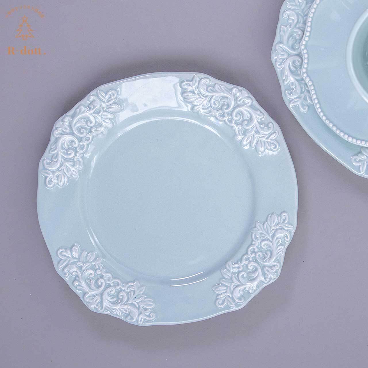 淡いパステルブルーにクラシカルなエンブレムをあしらったお洒落なデザインのラウンド型プレート。