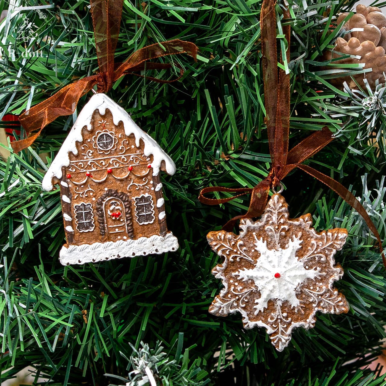 クリスマスの伝統的なお菓子ジンジャーブレッドのアイシングクッキーのお家とスノーフレークのオーナメント。